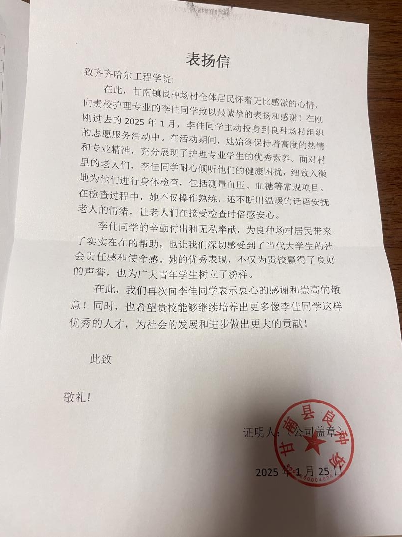 李佳同学的热情服务和专业付出,赢得了社区居民的一致好评。一位参与活动的老人感慨道:“现在的大学生真是好样的!小李不仅给我们免费量血压,还教了我们这么多健康知识,让我们心里踏实多了。”活动结束后,良种场村还特意为李佳同学寄来了表扬信。信中高度赞扬了她的奉献精神和专业态度,称她的行动充分展现了当代大学生的社会责任感,为构建和谐社会、关爱老年人健康贡献了积极力量。
