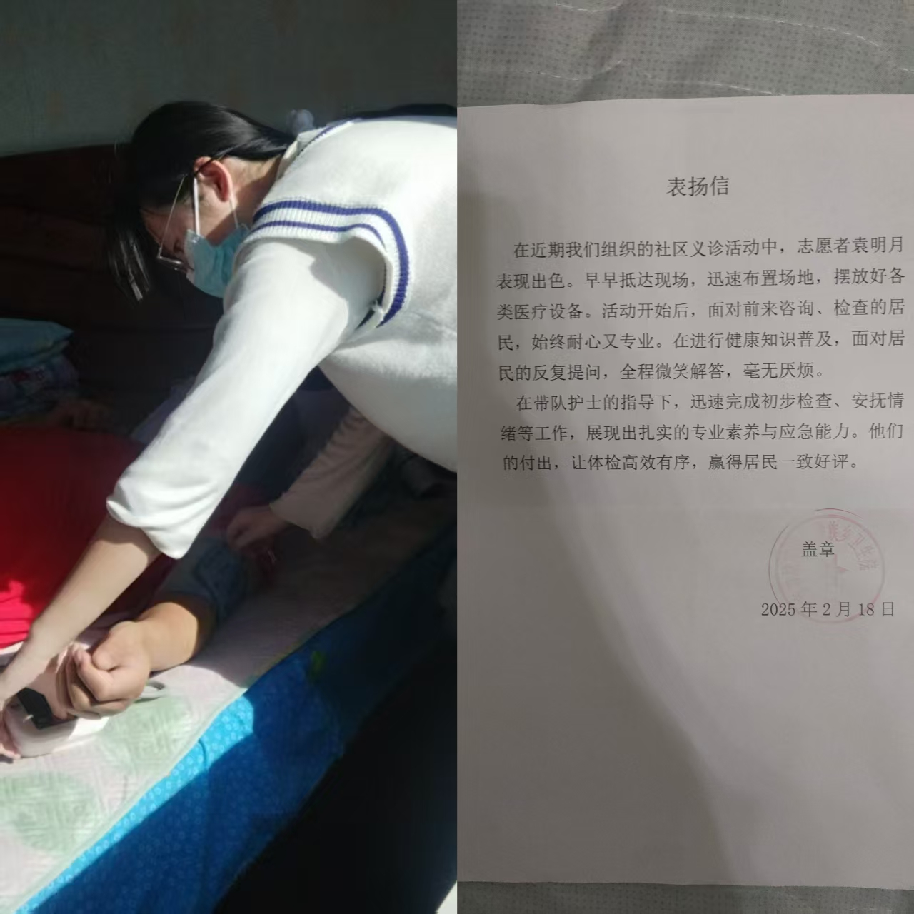 袁明月在带队护士的带领下,与其他志愿者前往玉丰村的教育家园,为行动不便的老人进行体检,袁明月负责测量血压并告知另一志愿者数值作为记录,两人配合默契。