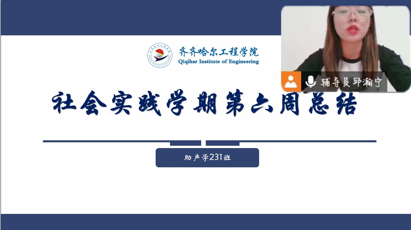 会议伊始,辅导员邱瀚宁老师对放假以来同学们社会实际学期完成情况进行了总结,随后让全体同学打开摄像头,随机抽取十二名同学汇报社会实践完成的进度,并在同学汇报的过程中辅导员邱瀚宁老师和每位同学依次确认社会实践所完成的和关的照片、视频或纸质版文字,通过连线检查各位同学的作业完成情况,邱瀚宁老师对完成度高,字迹工整的同学进行了表扬,希望其他同学都能够向他们看齐,在社会实践学期的最后一周好好完善自己的作业,查漏补缺。最后,辅导员邱瀚宁老师强调了一些开学注意事项,例如:同学们要备好衣物,感冒药等以防感冒;准备收心,做好开课的准备等。
