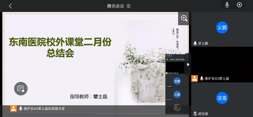 3月1日下午,指导教师辇士晶通过线上会议开展东南医院校外课堂学生本月总结会议。