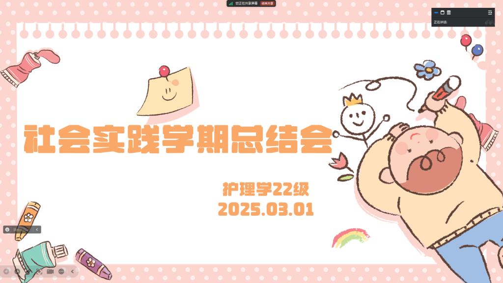 为进一步深化实践育人成效,总结社会实践学期经验,护理学2022级于2025年3月1日通过腾讯会议组织召开社会实践学期总结会。会议由辅导员李安琪老师主持,护理学22级全体学生参与。