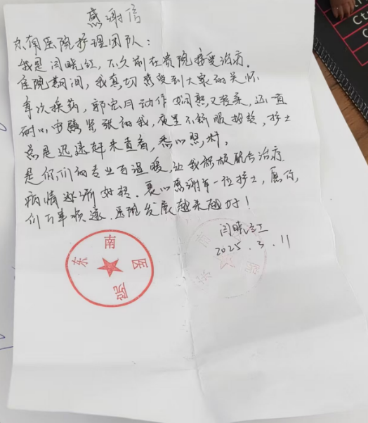 近日,在东南医院发生了一段温暖人心的医患故事,充分展现了医护人员与患者之间的深厚情谊以及我院优质的护理服务。
