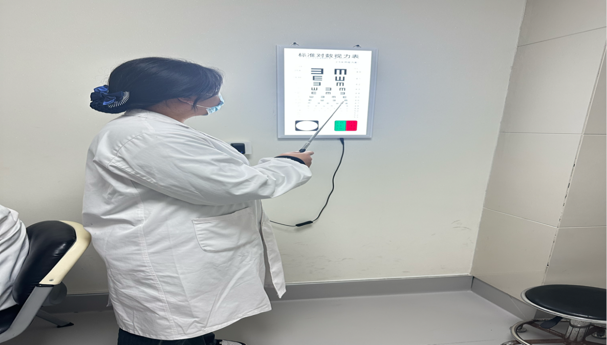 在带教老师指导下,学生们系统掌握了标准对数视力表使用、电脑验光仪操作及色觉筛查流程。通过每日接待200余人次的真实工作场景,他们不仅熟练了“先右后左”的规范检查顺序,更将课堂所学的医患沟通技巧转化为实际服务能力,为不同年龄段受检者提供个性化指导。