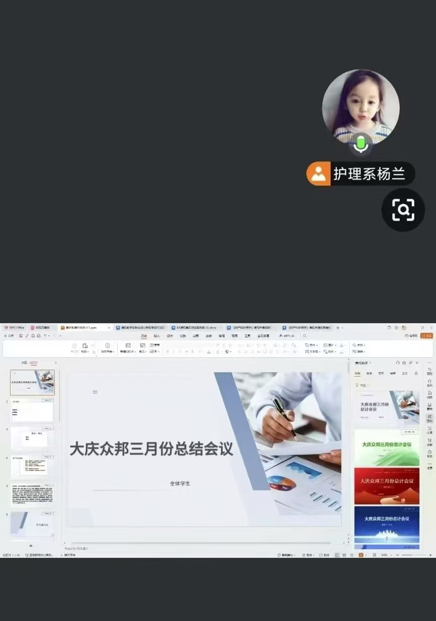 3 月 31 日下午,指导教师杨兰组织召开大庆众邦医院三月总结会全体学生线上参与,和同学们深入交流。会上,杨兰老师首先对全体同学在三月实习期间的辛勤付出表示肯定,并强调本次会议旨在总结本月工作成果、强化安全意识,同时贯彻我校“为融入社会走进来,为服务社会走出去”的办学宗旨。她指出,医疗实习不仅是专业技能的学习,更是责任与使命的实践,要求同学们以“亮剑精神”面对挑战——即敢于担当、迎难而上,在岗位上展现医学生的专业素养与人文关怀。