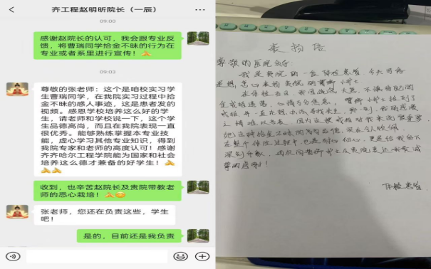 2025年3月16日周日上午,曹瑞同学在校外课堂哈尔滨一辰医院收到一封表扬信,因当天曹瑞同学在校外课堂哈尔滨一辰医院鹰眼检查室为患者体检时,患者疏忽大意不慎遗落了金戒指。这枚戒指对患者意义重大,丢失后患者心急如焚。曹瑞同学捡到戒指后,第一时间主动积极寻找失主,患者失而复得后感激之情难以言表,其拾金不昧的高尚品德令人钦佩。患者表示在体检过程中如有疑问,曹瑞同学都会面带微笑一一解答,耐心与细心更是给患者留下了深刻印象。