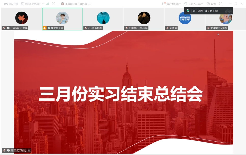 会议开始,于晶老师让实习生们依次讲述了实习的感悟,大家都结合自己的临床实习经历,从基础护理操作开始总结,分享了许多生动案例,展现了大家从理论到实践蜕变的过程,大家都学到了许多知识,并且能独立地做一些基础操作,从最开始的不熟练变成已经能从容地应对各类复杂的护理任务,于晶老师听完我们总结也说了许多鼓励我们的话。