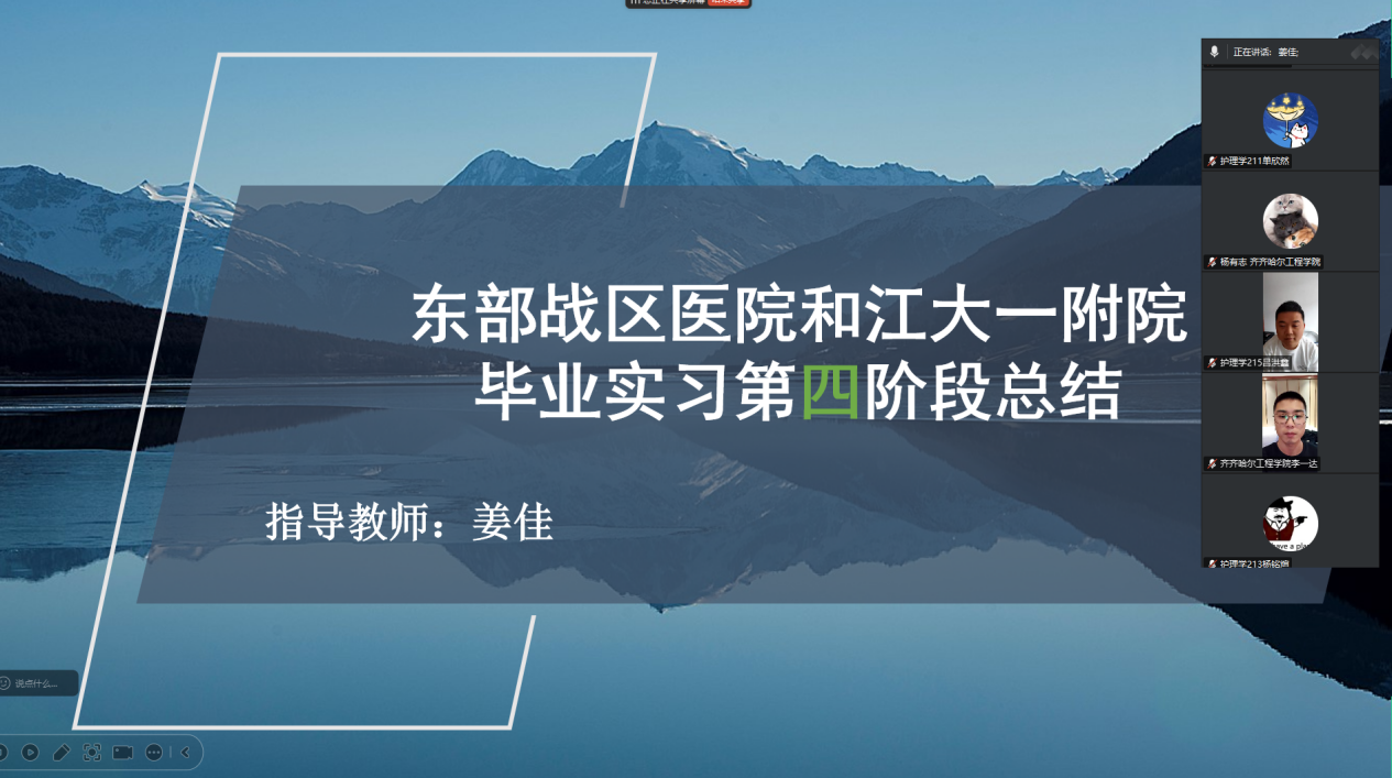 2024年10月31日,姜佳老师通过腾讯会议平台召开江大附属和东部战区总院毕业实习十月度总结报告,此次会议由护理学212班杨志强同学担任主持,全体实习同学和指导老师姜佳老师全员参加。
