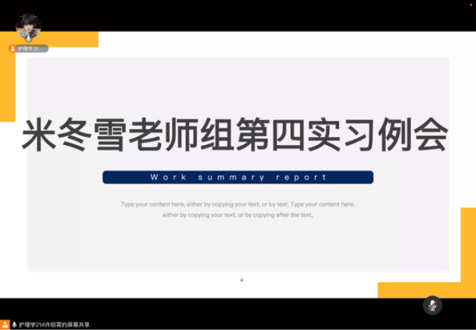 2024年10月18日,星期五,通过腾讯会议线上形式召开米冬雪老师组实习生第四次例会,本次会议由许丽霄主持,主要围绕学生实习进展与收获开展。