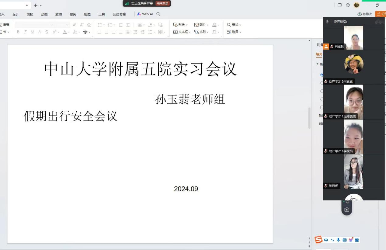 2024年9月13日,孙玉翡老师在中山大学附属第五医院为实习的同学们组织了一次针对假期出行安全的会议。孙玉翡老师首先指出,虽然假期是放松和休息的好时机,但安全问题不容忽视。