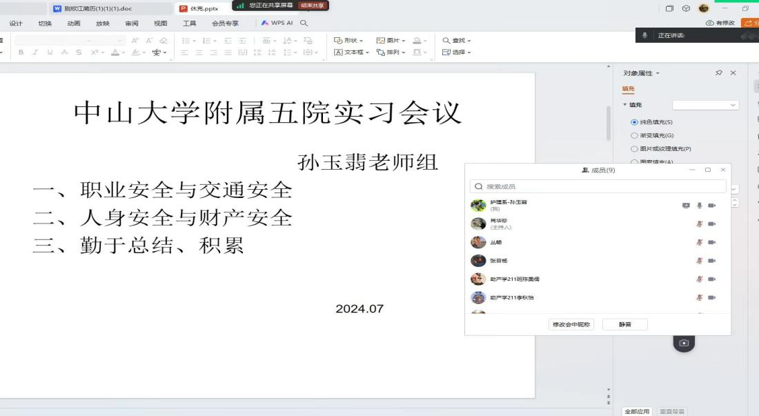 2024年7月6日,孙玉翡老师为中山大学附属第五医院实习同学组织了一次实习生安全会议。会议内容包括职业安全与交通安全教育、个人安全与财产安全保障、勤于总结与积累。会议旨在提高实习生的安全意识,确保实习期间的人身安全和财产安全,同时促进实习学生的专业成长和个人发展。