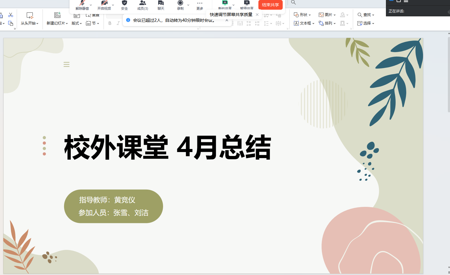 4月28日下午,指导教师黄竞仪在线上会议开展杭州城健医院校外课堂实践本月总结会议,学生张雪、刘洁线上参加。总结会上,师生共同回顾实习历程,梳理成果与不足。