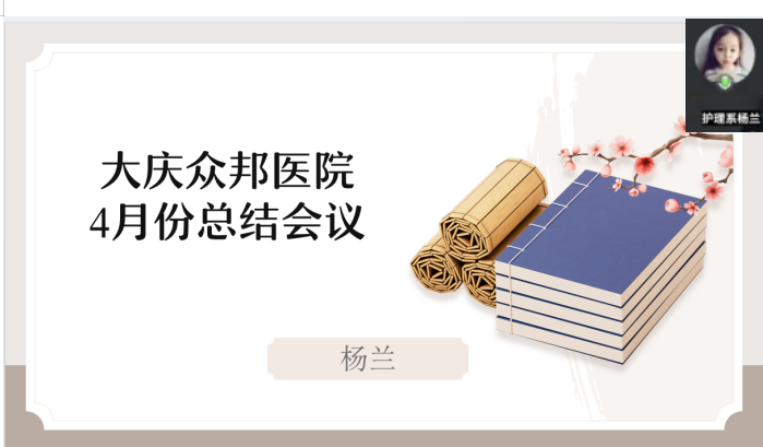 4月28日,康护工程系专业指导教师杨兰通过线上会议为在大庆众邦医院的学生进行4月份的总结和5.12视频的指导以及强调五一劳动节假期安全。