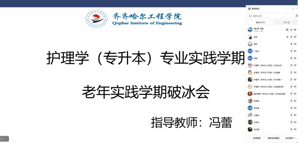 本次线上破冰会共有30名参与专业实践学期的同学参加。冯蕾老师热情欢迎同学们加入老年实践学期的项目,着重强调了此次实践活动对于同学们个人成长以及关爱老年群体的重要意义。指出这不仅是一个积累专业实践经验的机会,更是培养社会责任感、传承尊老爱老美德的重要途径。同时,点明破冰会旨在让同学们快速熟悉彼此,打造一个团结协作、积极向上的实践团队。