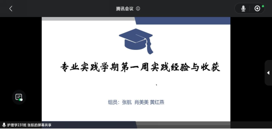 在会上,随机抽取了护理学231班张航小组进行第一周总结的汇报。张航小组的同学积极投身到医院的工作中去,虽然工作简,但是同学都干劲满满。汇报结束后,安迪老师针对每日打卡、反思总结等方面进行了点评。其他同学都都纷纷表示会努力学习、持续改进。两位老师在平时积极检测学生们的学习成果,并随时找人谈心谈话,询问是否对于实习方面与学习方面有什么不解和困扰,充分的解答了同学们的疑问并给于鼓励。