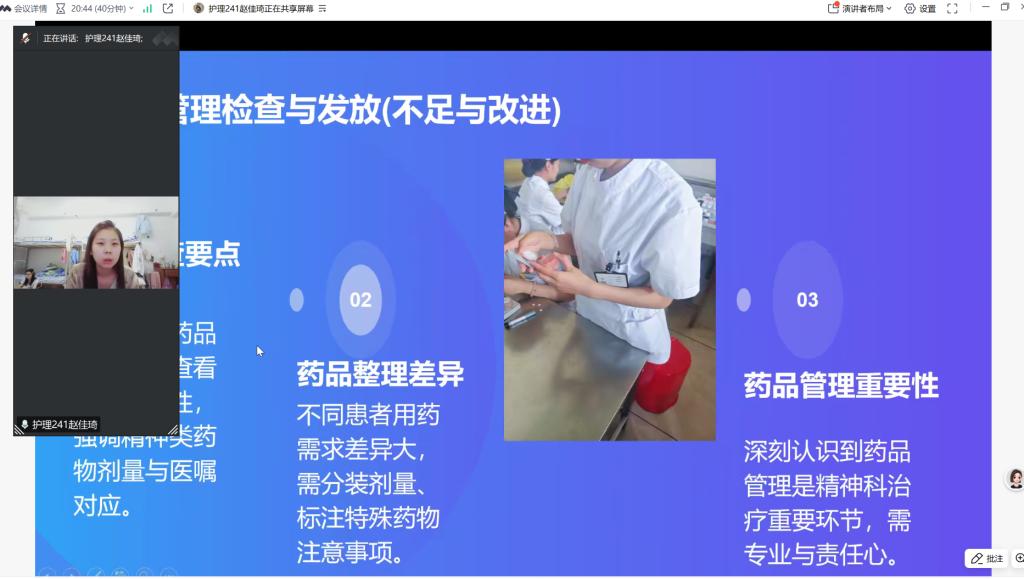 汇报中,实习生回顾了首周学习历程。医院岗前培训让他们系统掌握精神科疾病诊断标准、护理安全规范等理论知识。在带教老师指导下,他们熟悉科室流程,参与静脉输液、护理交接班等实操工作,逐步实现理论与实践结合。
