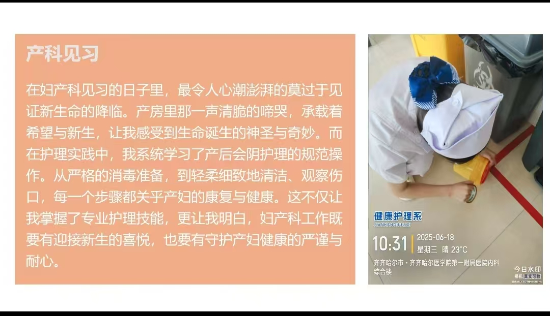 贾博慧在妇产科实习期间,了解了妇产科日常的接诊、检查及手术流程。她学习了产前检查的项目与意义,熟悉了产后护理要点,包括产妇的身体恢复护理和新生儿的基础护理。同时,她还参与了一些简单的妇科检查辅助工作,对妇产科疾病的诊断和治疗有了初步认识。