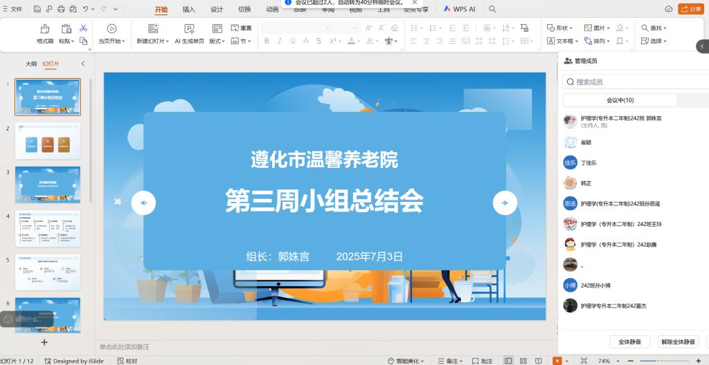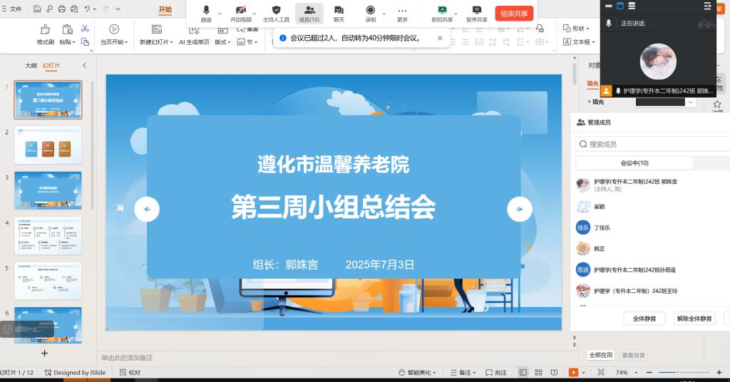 7月3日,遵化市温馨养老院专业实践学期学习小组组长郭姝言在腾讯会议召开第三周小组总结会,小组10人全员参加。