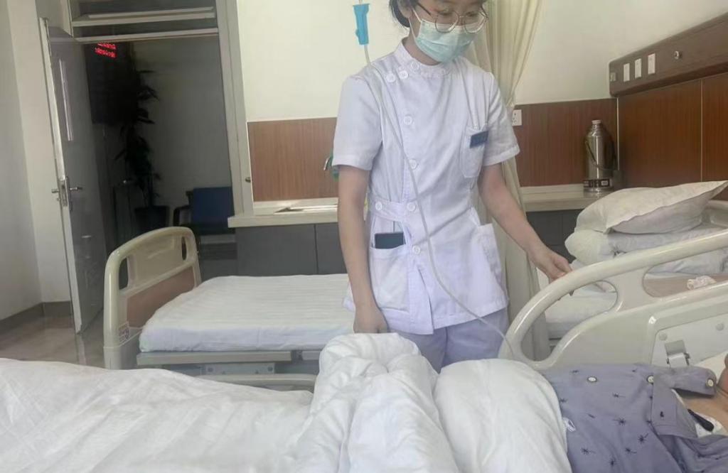 另外,骨科实习的同学则在带教老师的帮助下围绕换药和康复训练展开教学。管凤明同学参与骨折术后、关节置换患者护理,学伤口换药防感染,协助做关节屈伸训练。张嘉颖同学学会如何护理创伤和换药,给脊柱骨折患者翻身,协助肌力训练。