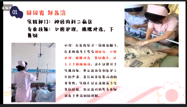 会议的核心环节是学生见习成果与体会的分享。范磊老师随机抽取了4组同学代表进行PPT汇报展示。从各组精心准备的汇报内容中可以看出,尽管身处不同科室,同学们在一周的实践中均收获颇丰,积累了宝贵的临床初步经验。大家踊跃分享了在带教老师指导下学习并参与的多种基础护理与临床操作,例如药品的规范配伍(挂药)、静脉输液技术的实践、以及规范的采血流程等。汇报内容生动展现了同学们积极融入临床环境的学习态度和初步掌握的专业技能。