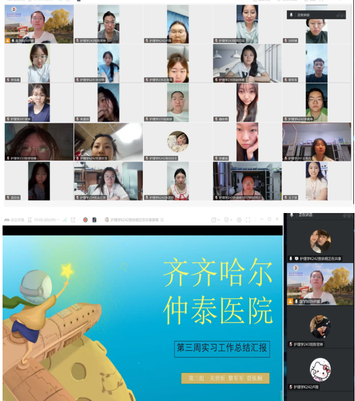 会上,仲泰医院护理学实习生贾依桐首先分享了自己的实习情况。他从工作内容、护理感悟等方面展开,同学们在静脉输液、药品配置等操作上,已经从最初的生疏逐渐变得熟练。对此,他强调,大家必须严格遵守“三查八对”制度,规范无菌操作流程,以此保障患者安全和护理质量。