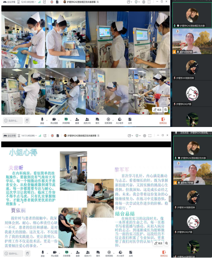 随后,天津汇中医院的同学们进行总结。他们分别在该院的内科和骨科开展实习工作。其中,在骨科实习的同学在带教老师的悉心指导下,从协助处理基础事务慢慢过渡到学习牵引装置维护等临床专业工作。他们深刻体会到,骨科护理工作对精准度和耐心有着极高的要求,同时也认识到自己在实际操作和专科知识方面存在的不足。