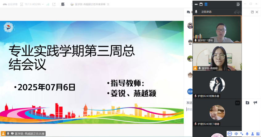 2025年7月6日建华医院小组召开第三周总结会议,学生们分赴内科、外科、骨科等多个科室开启实习。他们将在临床实践中锤炼技能,把理论融入护理日常,在医患互动中感悟职业价值。本次会议以学生分享为主。