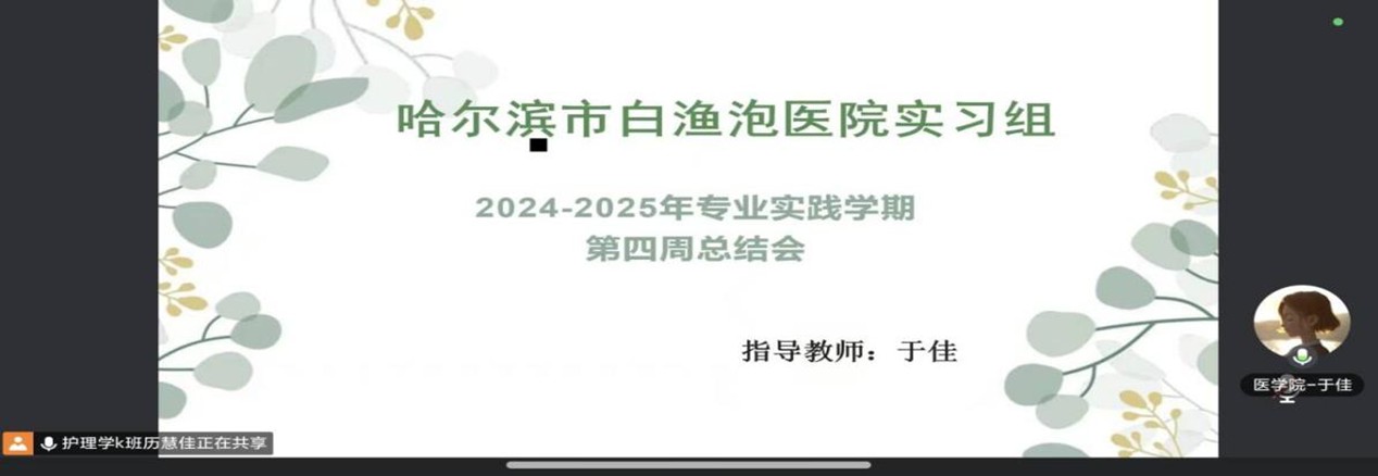 2025年7月10日,为总结在哈尔滨市白渔泡医院的第四周实习工作,在于佳老师的指导下组织召开了第四周实习总结会,介绍本次会议旨在梳理实习期间的实践经历、提炼收获与反思,明确后续改进方向,流程为同学们依次分享实习心得,随后由指导教师于佳老师进行总结点评。