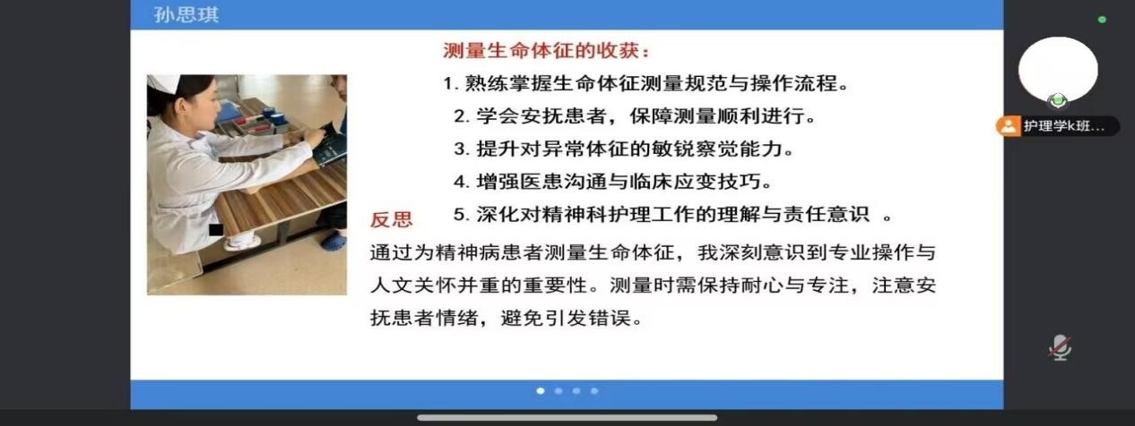 同学们的汇报涵盖多方面内容,包括在病房工作中的具体实践经历,如核对精神类药品及其重要性、监测生命体征并记录等;也涉及与患者沟通的技巧和体会,比如如何安抚患者情绪、缓解其抵触心理以配合治疗;团队协作中关于药品核对、患者日常监测等工作的配合与经验;同时包含了对自身工作的收获总结,例如熟悉操作规范、提升专业技能、培养严谨态度等,以及对工作中不足的反思。 总结会上,于佳老师肯定了实习同学的表现,认为大家掌握了精神科护理专业技能,理解了“专业与人文并重”的重要性;同时指出其在沟通技巧、临床应变能力上的不足,建议强化责任意识、遵守操作规范(尤其药物核对执行“四查十对”)、学习沟通方法及提升共情能力。