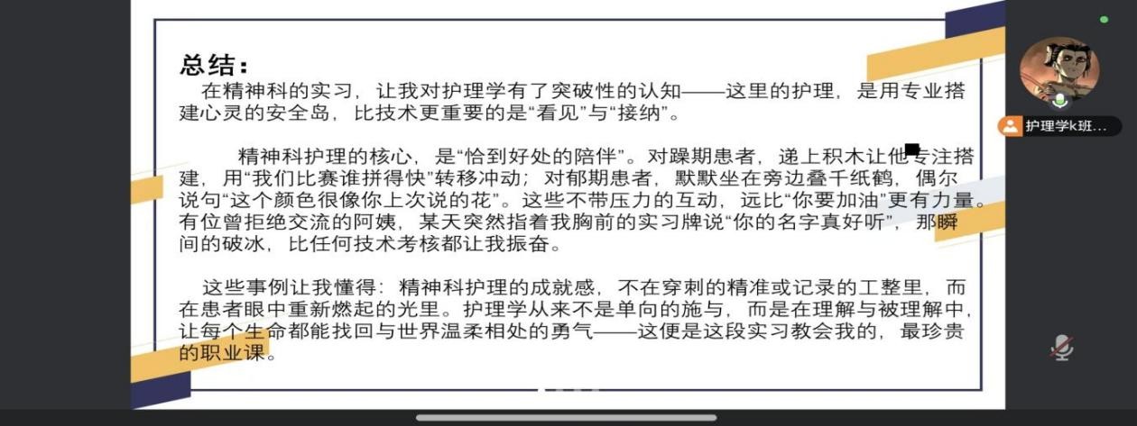同学们受益匪浅,既梳理了实习工作、明确了优劣势,也找到了前进方向,将在后续实习中改进不足,提升专业素养和服务水平,为患者贡献力量。