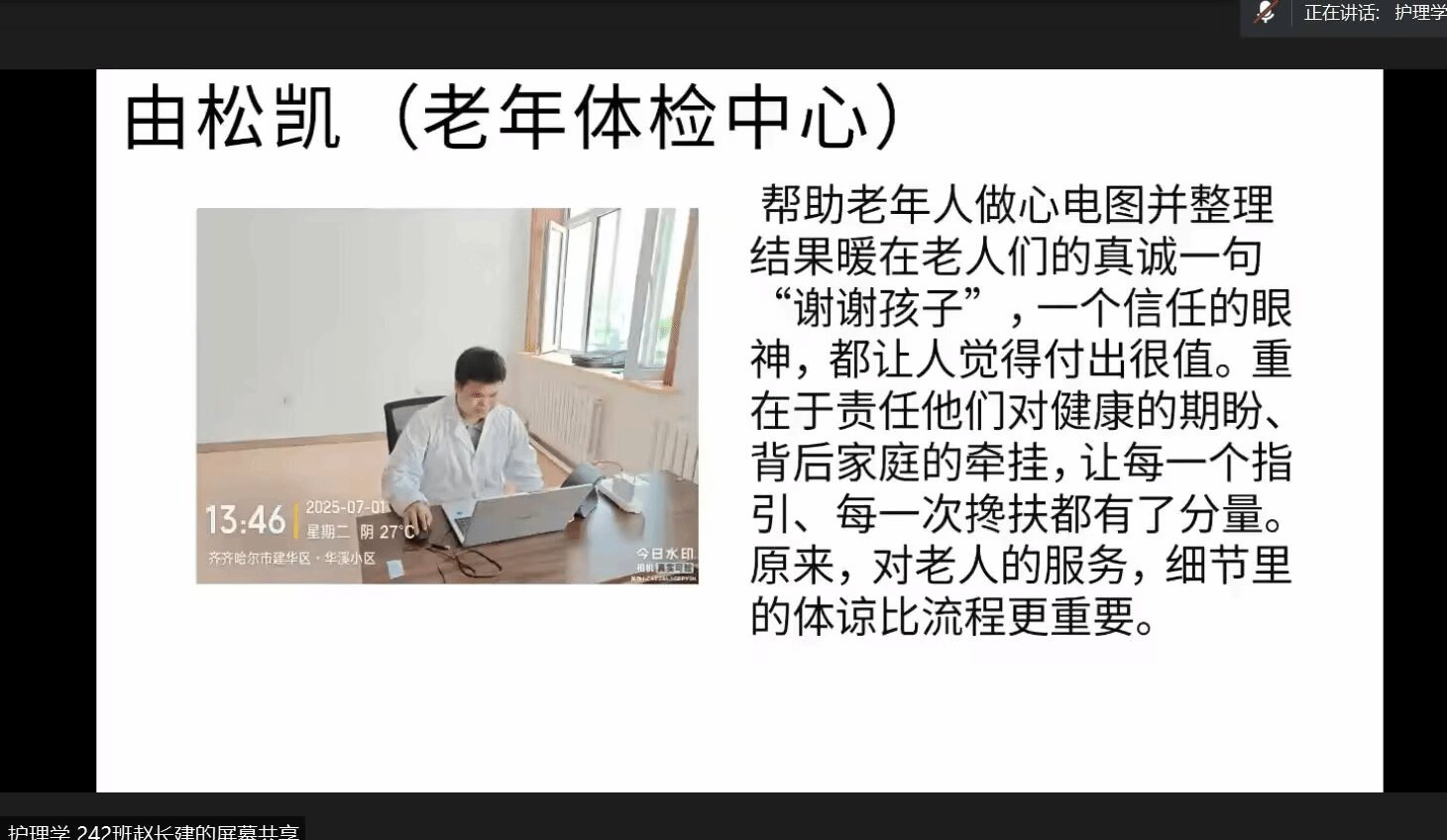 7月15日,第三周实习顺利结束后,为及时总结实习进展、凝聚提升方向,姜佳老师组织西大桥社区卫生服务中心的所有实习同学召开了线上总结会,全面梳理本周各岗位的实习情况。