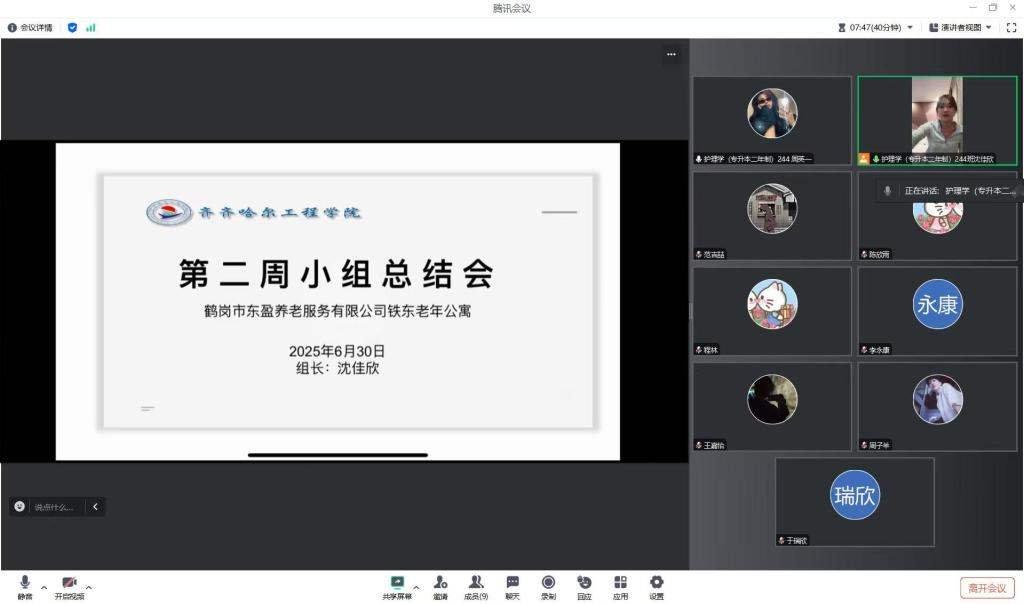 2025年6月30日,齐齐哈尔工程学院老年实习小组通过腾讯会议,召开鹤岗市东盈养老服务有限公司铁东老年公寓第二周实习总结会。组长沈佳欣主持,等其他8名成员齐聚线上,共同复盘实践内容,梳理问题与改进方向。