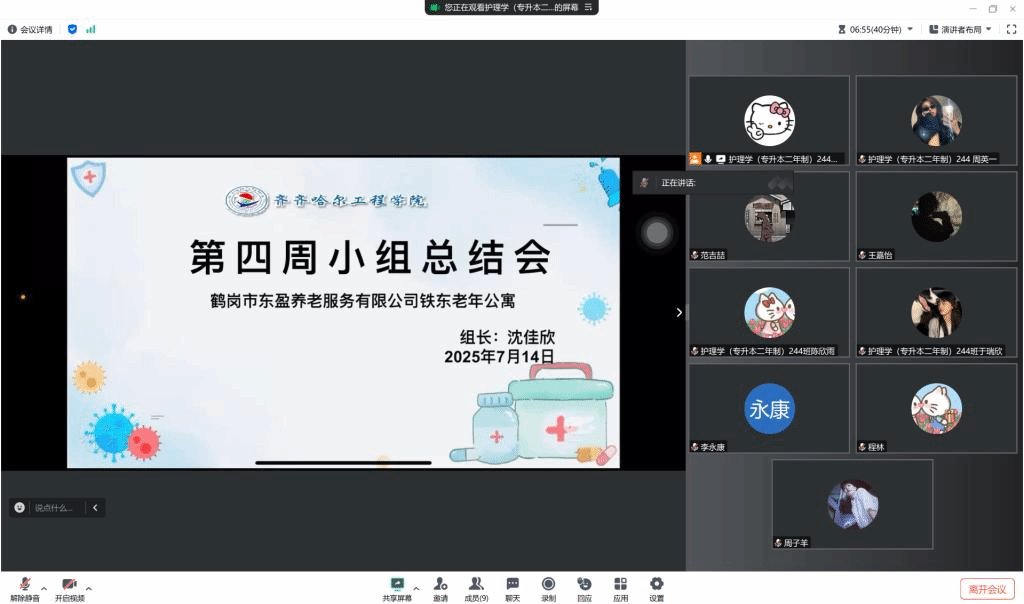 2025年7月14日,齐齐哈尔工程学院老年实习小组,在组长组织下召开了第四周实习总结会。会上,大家围绕这一周的养老服务工作展开深入交流,既梳理了阶段成果,也探讨了遇到的问题。