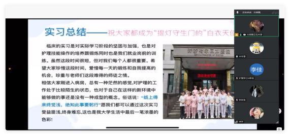 最后米冬雪师讲解了关于专业实践学期安排以及任务要求,米冬雪老师还着重讲解了实习安全教育,讲解了针刺伤如何避免以及发生针刺伤如何解决,要注重操作规范,可以及时有效避免针刺伤,如自身有创口,避免接触患者体液,做操作之前戴好手套,保护自身安全。会议末尾,米冬雪老师对本周实习情况做了总结。