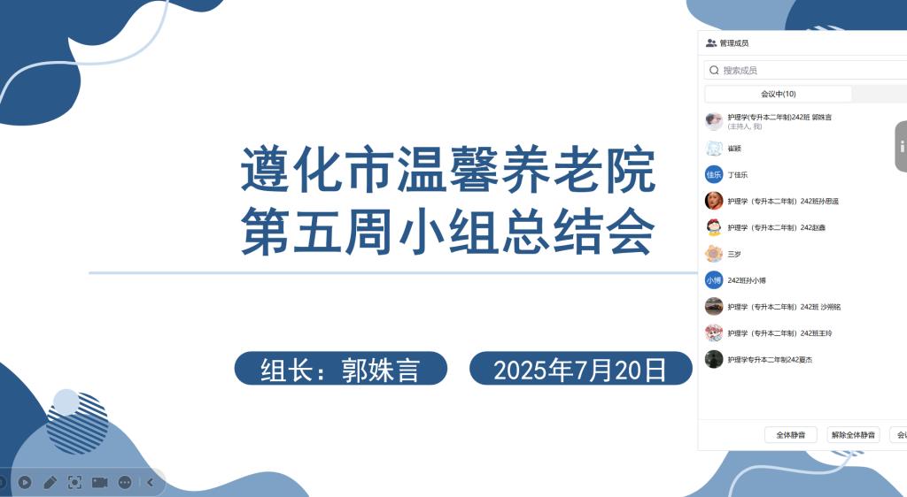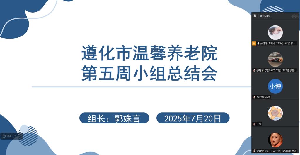 7月20日,遵化市温馨养老院社会实践学期学习小组召开第五周工作总结会,全体成员梳理本周实习进展。