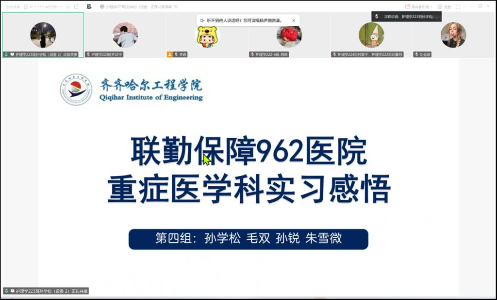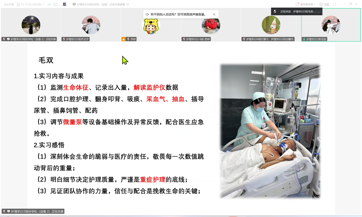 在会议过程中,来自不同小组的同学代表依次进行汇报。首先是第三组同学分享了自己在血透室的实习经历。参与了血透室日常文书工作,协助科室物资清点与管理,保障了临床透析治疗的物资供应。在患者治疗前进行用物的准备,每小时进行测量生命体征等。第四组的同学则汇报了自己在重症医学科(ICU)的实习情况。实习期间,熟练掌握了监测生命体征、记录出入量、解读监护仪数据等基础技能,采血气、抽血、插导尿管、插鼻饲管、配药等多项护理操作。同时,还学会了设备基础操作及异常反馈,积极配合医生进行应急抢救。同时也明白了细节决定护理质量,严谨是重症护理的底线,也见证了团队协作在挽救生命过程中的关键作用。此外,其他同学也分别围绕各自所学的知识技能,从实习内容、获得成果、实习感悟等多个方面进行了精彩汇报,充分展示了他们在实习过程中的成长与收获。
