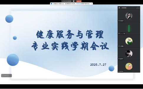 2025年7月27日晚八点,吴雪洋老师及全体专业指导教师袁凤娟、毕茎娜,与23级健康服务与管理专业的36名学生,在线上开展专业实践学期第六周总结会议。本次会议聚焦梳理彩虹社区、建设社区、西大桥社区专业实践工作,同步融入安全指南教育,助力学生筑牢实践根基、强化安全意识。