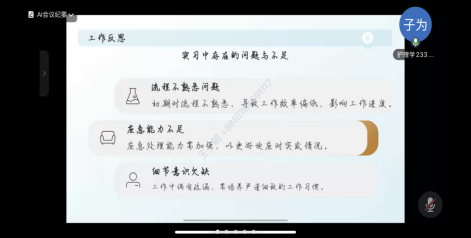 其次,老师对本次会议给予肯定并鼓励学生们以严谨的态度对待实习工作的每一项,在未来的实践中收获更多成长。此次汇报同学不仅清晰阐述了工作流程,更提炼出实践中的感悟——以严谨和实事求是的工作态度对待每一个工作流程。