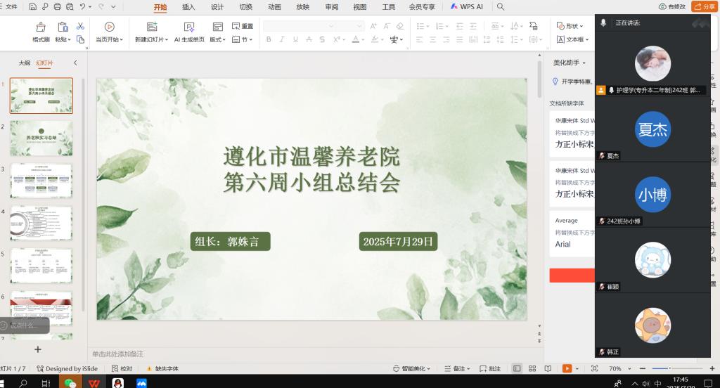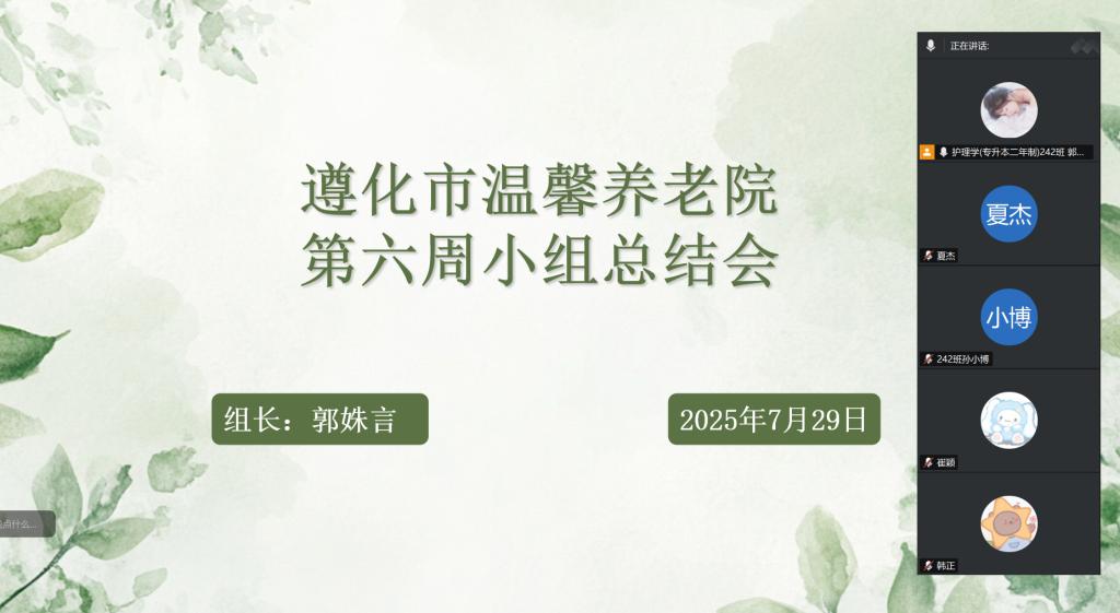 7月29日,遵化市温馨养老院实习小组第六周总结会如期召开。作为本次实习的最后一周,全体成员围绕“践行护理初心,沉淀实践感悟”主题,分享实习收获,复盘服务细节,为为期六周的养老院实习画上圆满句号。