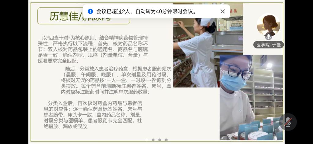 会议伊始,由郝源鸿和孙思琪两位同学围绕本周实践的核心内容展开,详细梳理了在自备药品投发、静脉输液操作、心理治疗辅助以及组织公共娱乐活动等方面的工作进展、具体实践、心得体会及存在的不足。他们的汇报全面反映了同学们在本周实践中的学习成果与岗位适应情况。
