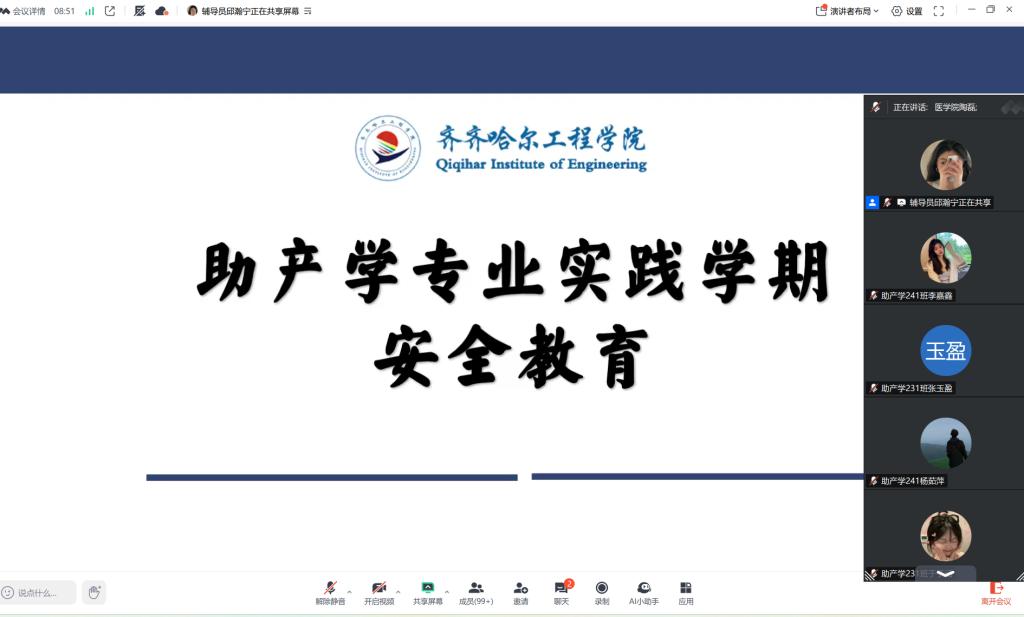 7月29日中午,齐齐哈尔工程学院医学院助产学专业线上召开了实习安全会议,会议由助产学专业专业长马静主持,辅导员江丽娜、邱瀚宁及全体2023、2024级学生及家长参与。会上马静老师首先强调了学生在实习过程中需要注意的安全内容,如避免针刺伤,要严格按照操作规程进行相关操作,一旦出现针刺伤要及时上报,尽快处置。不要和患者产生不必要的冲突,与患者出现沟通问题时,要及时上报,由医院人员进行处置,不要自行应对,避免造成人身伤害。同时近期自然灾害问题时有发生,大家要及时关注天气预报和各类预警信息,做出合理的应对。