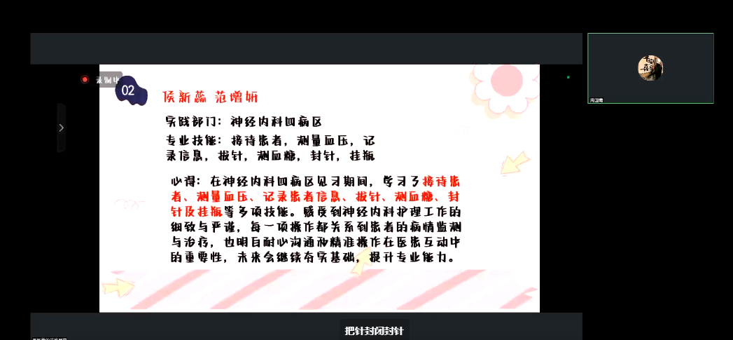 随后,在线上随机抽取了三组同学来进行关于第六周相关任务的汇报工作。被抽到的同学们都非常认真地进行了汇报,他们分别详细地分析了自己在近期见习过程中的收获与成长,从不同的角度分享了自己的心得体会。