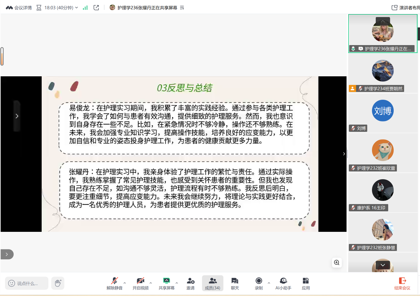 会上,王印老师首先对同学们在第六周实习中的成长与突破予以高度赞扬。经过六周的实战打磨,大家在临床实践中的应变能力和独立处理问题的水平又上了一个新台阶。面对科室里突发的紧急情况,能够迅速冷静下来,凭借扎实的专业功底做出初步判断和处理,为后续治疗争取了宝贵时间。在与患者沟通方面,也更加得心应手,既能准确传递病情信息,又能耐心安抚患者情绪,人文关怀意识日益增强。在团队协作中,同学们的配合愈发默契,不仅能高效完成自身工作,还能主动协助同事解决难题,提出的建议更具操作性,职业素养和团队协作能力进一步提升。