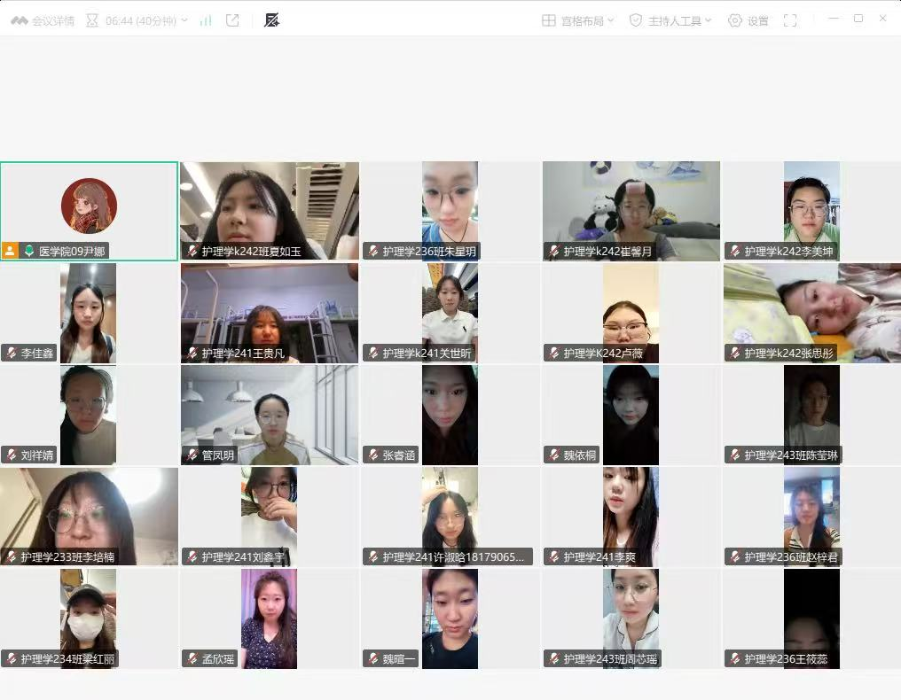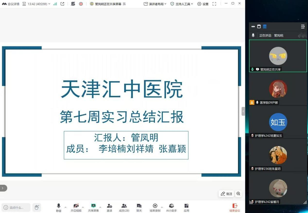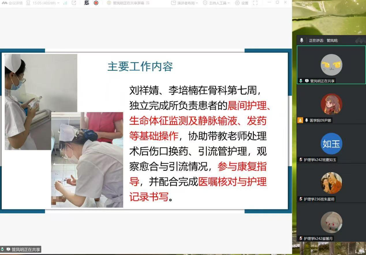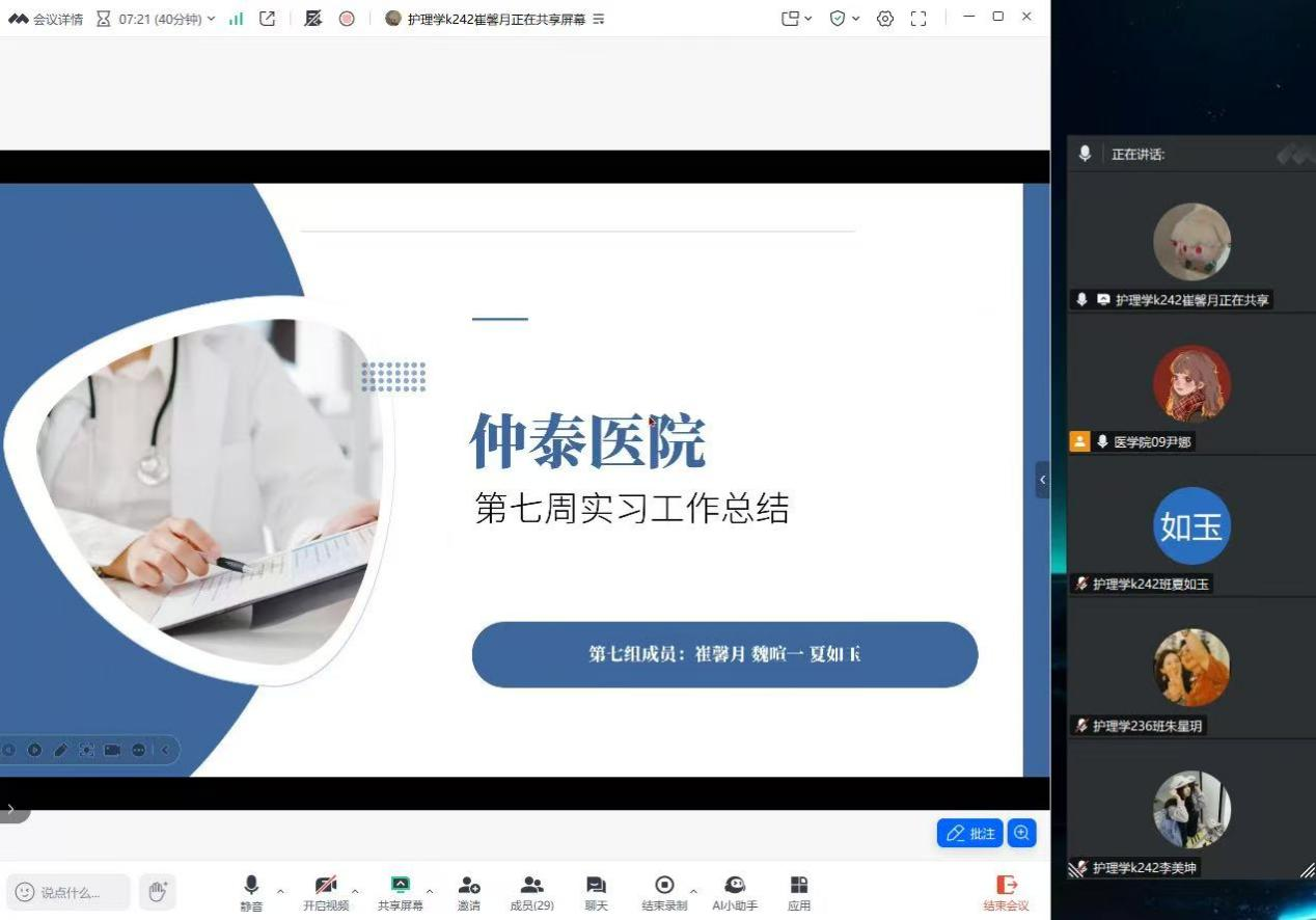 为总结第七周实习经验,8月1日晚7点20,尹娜老师组织召开护理实习第七周总结会议,这也是专业实践学期的最后一周总结,会议通过腾讯会议开展。