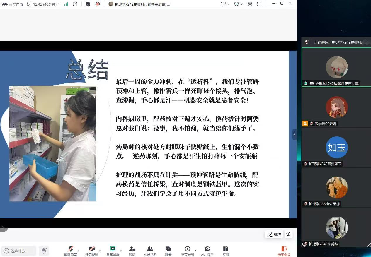 会上,仲泰医院崔馨月率先回顾第七周实习。作为实践学期最后一周,同学们在不同科室全力冲刺,七周实习转瞬即逝,从初入科室的手足无措到独立操作时的沉稳从容,每一步成长都浸透着实践的印记。内科病房的三查八对里,让我们读懂了严谨是护理的基石;透析室紧盯管路的专注中,让我们深知精准是生命的防线;药房翻查药品的细致里,让我们明白责任重逾千钧。患者的每句鼓励、老师的每处指正,都化作成长的养分。那些沟通中的不足、应急时的生涩,已成为复盘清单上的坐标。这段经历不仅夯实了操作技能,更让我们懂得:护理既是科学的严谨,亦是人文的温度。
