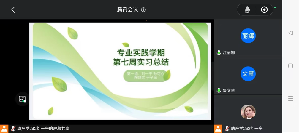 为系统总结自主实习学生第七周实践成果,精准锚定后续提升路径,8月2日,景文慧老师、江丽娜老师借助腾讯会议平台,组织开展了实习第七周总结交流会,三组自主实习同学线上参会并作汇报。