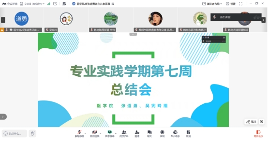 为总结老年护理实践和社区护理实践成果,并布置第八周线上答辩事宜,医学院张道勇组与吴宪玲组全体实习学生于8月3日晚召开了第七周专业实践线上总结会。