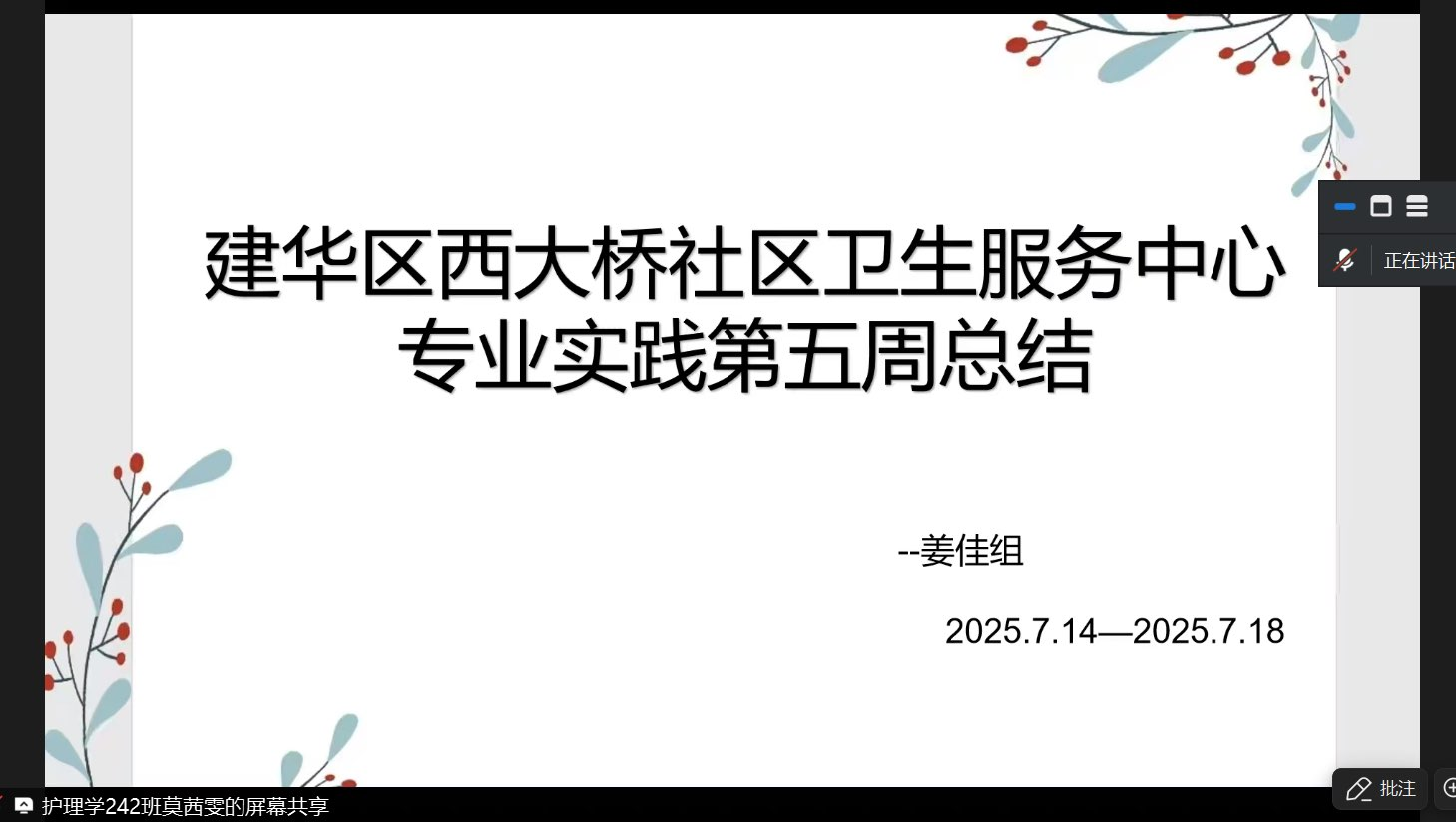 为了系统总结西大桥街道社区卫生服务中心护理专业实习第五周工作,姜佳、于佳两位指导教师召开线上总结会议。会议以PPT汇报形式进行,全体实习生依序陈述临床实践与健康服务成效。