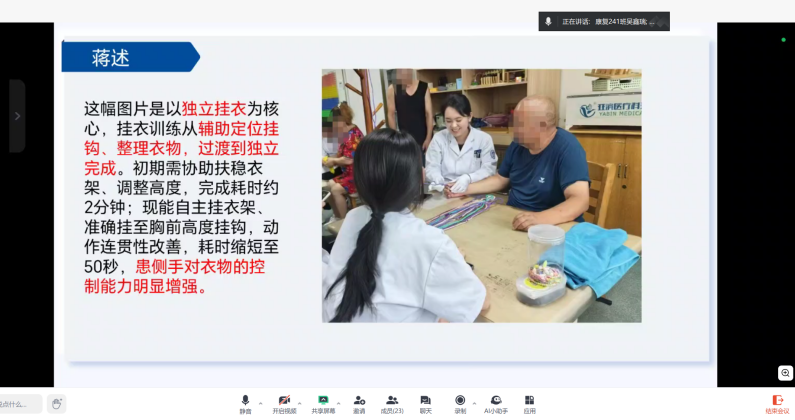 同学们以PPT形式展示了在附属第二医院康复科的实习成果。同学们结合实习中的真实案例,分享了运用Bobath技术、关节松动术等专业技能的实践心得,也反思了面对老年患者沟通障碍、治疗依从性低等问题时的解决策略。指导教师张妍从专业规范性、临床思维、表达能力等方面进行点评,肯定了同学们在康复评估精准度和治疗方案个性化上的进步,同时针对操作细节提出改进建议。会上,学生代表分享了在附属二院各科室的实习经历与感悟。OT科室实习中,郭子晴体会到“以患者为中心”的真谛,看到治疗师根据脑卒中患者习惯调整方案,如用绑带辅助模拟进食,助其重获生活掌控感;韩娜从初入科室的茫然,到在带教老师指导下为脑瘫患者做屈肘训练,深刻认识到康复需专心、爱心与耐心。理疗科室的同学介绍了半导体激光治疗仪、磁振热治疗仪等设备的应用。