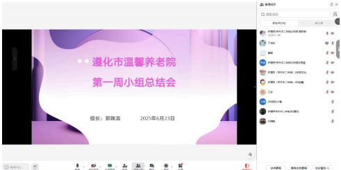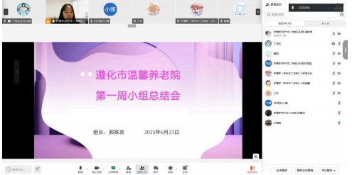 为进一步提升护理专业学生社会实践能力,深化对老年护理工作的理解与感悟,遵化市温馨养老院小组于6月23日在腾讯会议召开周总结会。本次会议旨在总结一周实践成果,交流服务经验,反思不足,明确下一阶段实践方向,全体小组成员参与会议。