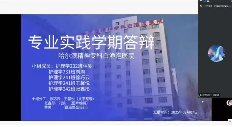 2025年8月8日,在哈尔滨市精神专科白泡医院进行专业实践的50名学生开展专业实践学期答辩汇报工作,总结实践期间的成长与收获。